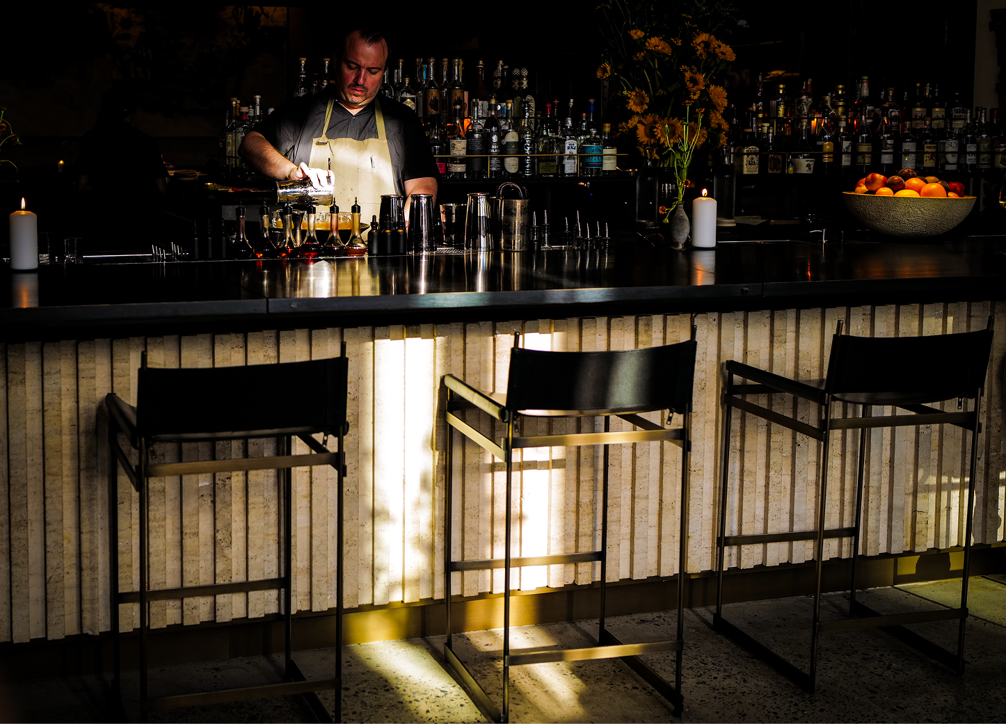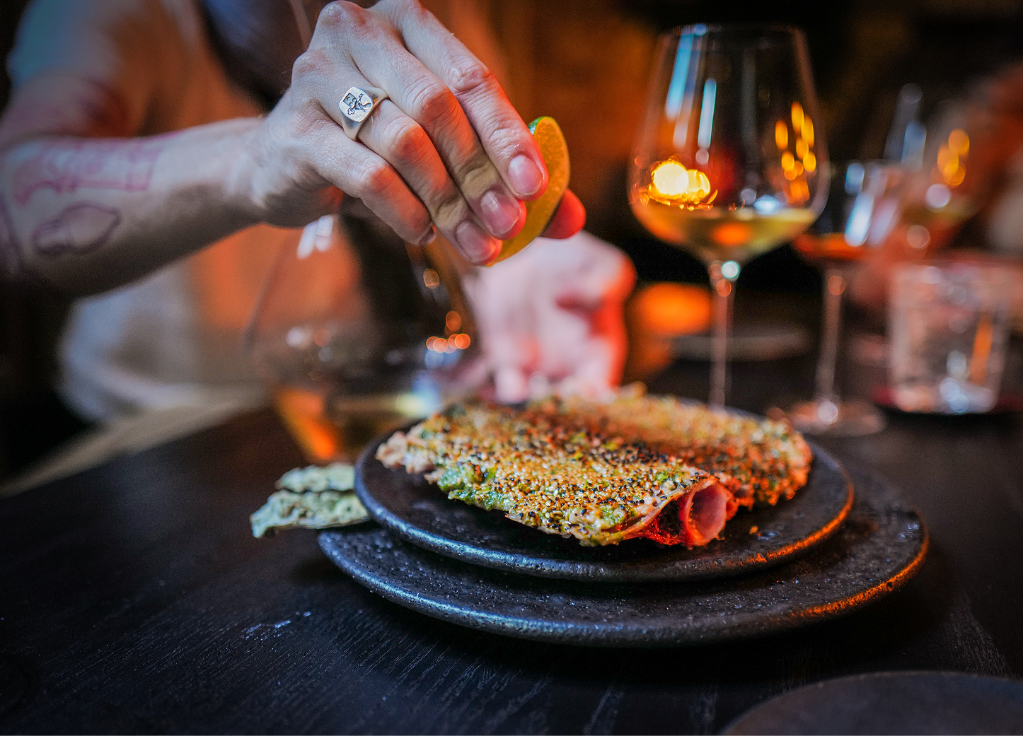 “Whatchyou drinking, Dahmer?” Marcin wants to know, now seated underneath Ilis’ cathedral-like ceiling. He poses this question to Jeff, as in the photographer, who he’s taken a shine to, and who he’s nicknamed after the infamous serial killer due to Jeff’s, well, Dahmer-esque glasses. Ilis’ proprietor—Chef Mads Refslund—is a co-founder of noma, and the cocktails are exactly the type of whimsical yet earthy drinks one would expect from a place with such illustrious DNA (the gin-laced passion fruit being the clear winner — “fuuuuck,” is all Marcin has to say). So, too, is the otherworldly clam flask, which we tentatively sip clam and tomato juice from as if guests in a strange land. Then it’s onto the tuna bone, which we scrape raw tuna from with oyster shells, before it’s whisked away, only to be brought back, this time with the underside cooked and seeded.