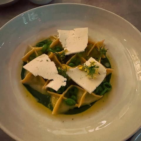 After recommending that my brother and sister-in-law check out Santi this week, I decided to give it a shot myself after they came back with rave reviews. Santi marks the full-circle return of Chef Michael White to NYC, in the space that previously housed Alto, which he originally opened with Chris Cannon in 2010. While I never got to try it in that incarnation, I was always a longtime fan of Marea, so I was excited to check out his newest spot. The restaurant is incredibly unassuming, almost hidden from the street with very little signage. A friend and I were in midtown after an event, and after nearly walking right by the entrance, we decided to grab a seat at the bar. The restaurant was very moodily lit in a really elegant way. The staff was welcoming, and the service was really on point. The menu looked full of hits, and even though we were looking for a fairly small meal (by my standards), there were too many great options not to indulge at least a little. The bread course was fantastic, reminding me of the original Marea bread service. I opted for both a deliciously oily focaccia and sourdough, and it came with both salted olive oil and a puck of butter, the restaurant’s name written across it. We began with a unique sardine dish featuring summer squash, buttermilk, and sourdough crisps. I don’t believe in the old “don’t mix fish and cheese” rule, and this dish proved it with the creaminess of the buttermilk playing nicely with the balance of the sardine, squash, and what I believe was ricotta salata shaved over the top. Next up was the warm seafood salad, which I was most excited to try, and it definitely lived up to expectations. Warm shrimp, octopus, scallops, and cuttlefish cut into bite-sized chunks and mixed with tomato conserva, olives, frisee, and basil—it’s a dish I’ll be craving for a while. While in season, I’ll rarely pass up soft-shell crab, and we were kindly rewarded with a perfectly fried version topped with ramp aioli, accompanied by pickled ramps and a herby tarragon sauce called pomodoro verde. Following the apps, we finished off with a selection of two pastas. We started with a predictably delicious orecchiette with blue crab and sea urchin that was really well balanced with the briny urchin and sweet crab mixed with the ear-shaped pasta. My favorite, however, was the fiocchetti, beautiful little purse-like pouches filled with Robiola cheese with sugar snap peas in a light herbal broth with a bit more salty cheese shaved over the top. It was a truly great dish at a restaurant that is still somewhat under the radar. I highly recommend checking it out during the dregs of Summer as midtown empties.