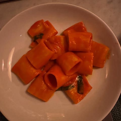 After our “light” bites at Minetta, we made our way to Flatiron because we were both looking for pasta, and Massara seemed like a fun choice. I hadn’t been in a while, but I have had great meals here in the past and was pumped to come back for a snack. We had no wait at all and were quickly seated at the downstairs bar as a walk-in on the later side. Unfortunately, they were out of their “pizzettes,” which, in my opinion, are a must-order, but they still had all of the pasta available. My go-to order is always the candele served with something like a 3-day ragu genovese, and it is one of my favorite pastas in NYC. The other pasta we ordered was a simple and delicious paccheri pomodoro. Bright with a wonderfully acidic and sweet tomato sauce, the large, tubular pasta was a perfectly textured bite. We finished the night with a delicious Baba Rum and a torta di ricotta e pistachio.