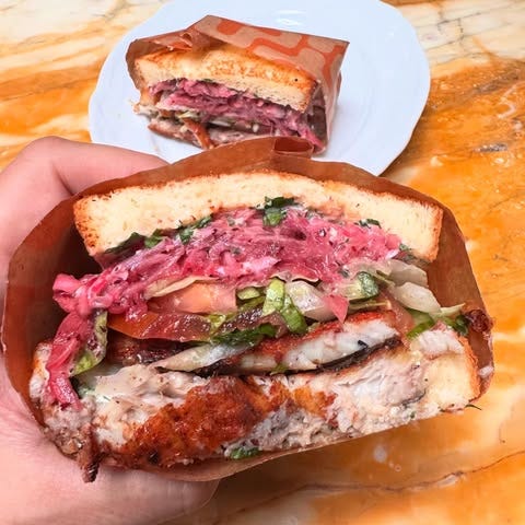 My buddy Jaeki Cho from Righteous Eats was doing a special at Strange Delight as part of their “Live Laugh Loaf” early week rotating sandwich collab for charity and he hit me up to swing through and try his loaf. I hadn’t been to Strange Delight since they opened so this was a great chance to swing by solo and have a small bite. All of the sandwiches sprang from the minds of guest chefs or influencers, executed (and perfected) by the very capable hands of Chef Ham and his team on their housemade milk bread. I sat at the back bar and ordered a bracingly cold 50/50 to pair with the raw oysters I got to start. I also decided to order a new dish from the menu I hadn’t seen on my previous visit, which was a som tam made with mirliton, which is a chayote squash in southern Louisiana. I ordered it with the addition of shrimp, and it was truly fantastic, with all the salty, spicy, and sour Thai flavors coming through to make it incredibly addictive. A real highlight dish that I hope will stay on the menu. For Jaeki’s sandwich, he was inspired by a recent trip to Istanbul, where he saw this sandwich everywhere, served as a wrap. The sandwich consisted of roasted mackerel, red onion salad, tahini, sumac, cucumbers, and pomegranate molasses and was really great. Something about it tasted nostalgic, and it was another thing I had a hard time putting down. I need to go back with a larger group and try some more of the newer dishes, as it’s fun to see how this place has evolved.