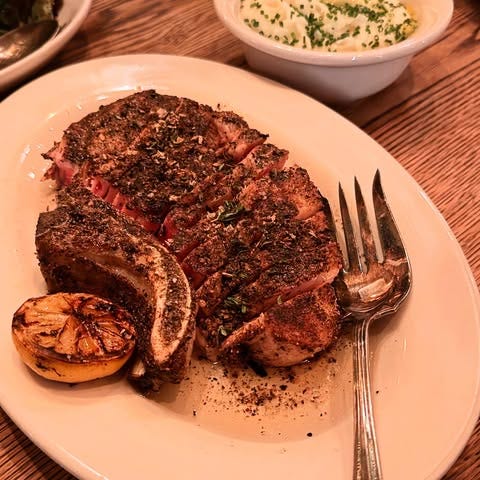 Dunsmoor has been on my list of places to go for what feels like years at this point, and as inconvenient as it may have been to get to from where I was staying, I made it a priority to go on this trip. The restaurant comes from Chef Brian Dunsmoor and is known for its wood fire cooking and the fact that no machines are used at all to prep or cook anything on the menu. For anyone who has worked in a restaurant, this is a wild thing to do, and they pull it off wonderfully, with honest, delicious food. Dining in a wood-fired restaurant in a heat wave isn’t always the wisest choice, but the meal was very much worth the trek across town, and I would highly recommend checking it out. We started out with oysters topped with ramp vinegar, which was a really nice, light, briny bite to get the ball rolling. Following the oysters, we went with the famous sourdough cornbread with cheddar, hatch chili, butter, and honey served piping hot in a skillet. The cornbread itself was really flavorful with a nice savory-sweet balance. Next up, a truly delicious shrimp and grits-like Carolina gold rice with shrimp butter, parm, and chives. The dish was bursting with umami and full of comfort food appeal. My favorite dish of the night and quite possibly the trip, though, was the famous pork and green chile stew, served with flour tortillas. The amount of flavor in this dish is hard to describe, and even in the heat of the fire, I could not get enough of it. An absolute must order and a dish that makes this a must-visit restaurant. We finished up with the mushroom-crusted pork chop with smoked lard and thyme. The pork was really nicely cooked and juicy with bits of char on the edges. Rounded out with really nice mashed potatoes and a small salad of dressed lettuces, we were absolutely stuffed. Of course, there is always room for dessert, so we went with the sticky date pudding, and I’d definitely order it again.