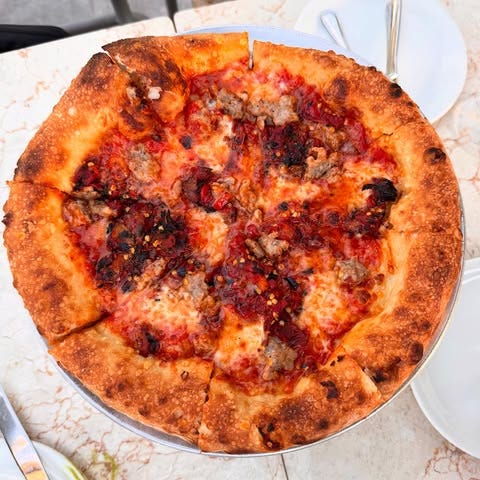 My first stop in LA was my friend Jeremy’s brand new restaurant and new LA hotspot, Beethoven Market. Beethoven is a beautiful new restaurant tucked away on a residential street in Mar Vista, on the west side of LA. From the moment it opened its doors, the place has been slammed, and after my meal last night, I fully understand why. The room feels great and really nice in an unpretentious way. The service is super friendly and knowledgeable, which is always hard at a new place. The food is Italian-leaning and filled with the hits that make it the perfect neighborhood spot. We started off really strong with two of the specials that were absolute hits. First, the baby plums, fresh from the market, served over burrata, pistachio crumble and olive oil. Such a delicious dish with the slightly sour plums pairing really well with the creamy cheese. Second was the lightly fried Delicata squash rings topped with chili honey that could not have been more addictive. Tuna carpaccio served drizzled in olive oil with capers and shallots, pounded paper-thin and topped with a lemon quarter for a little hit of acid, was another really nice bite. We followed that with a walnut pesto paccheri that was exactly as it should be and rounded it all out with an absolutely delicious pizza topped with sausage and Jimmy Nardello peppers. The Nardellos added a smoky sweetness that really made it a memorable bite. For a restaurant not specializing in pizza, this was truly a great pie. Desserts are all delicious, and we ordered a few gelatos as well as a chocolate lava cake and a big scoop of tiramisu, served tableside from a large serving dish in a nice service touch. Besides this being a great neighborhood spot that feels like it’s hit the right place at the right time, this is the first restaurant I have been to in forever where I left feeling like the menu was a lot cheaper than I expected based on the quality of the meal.