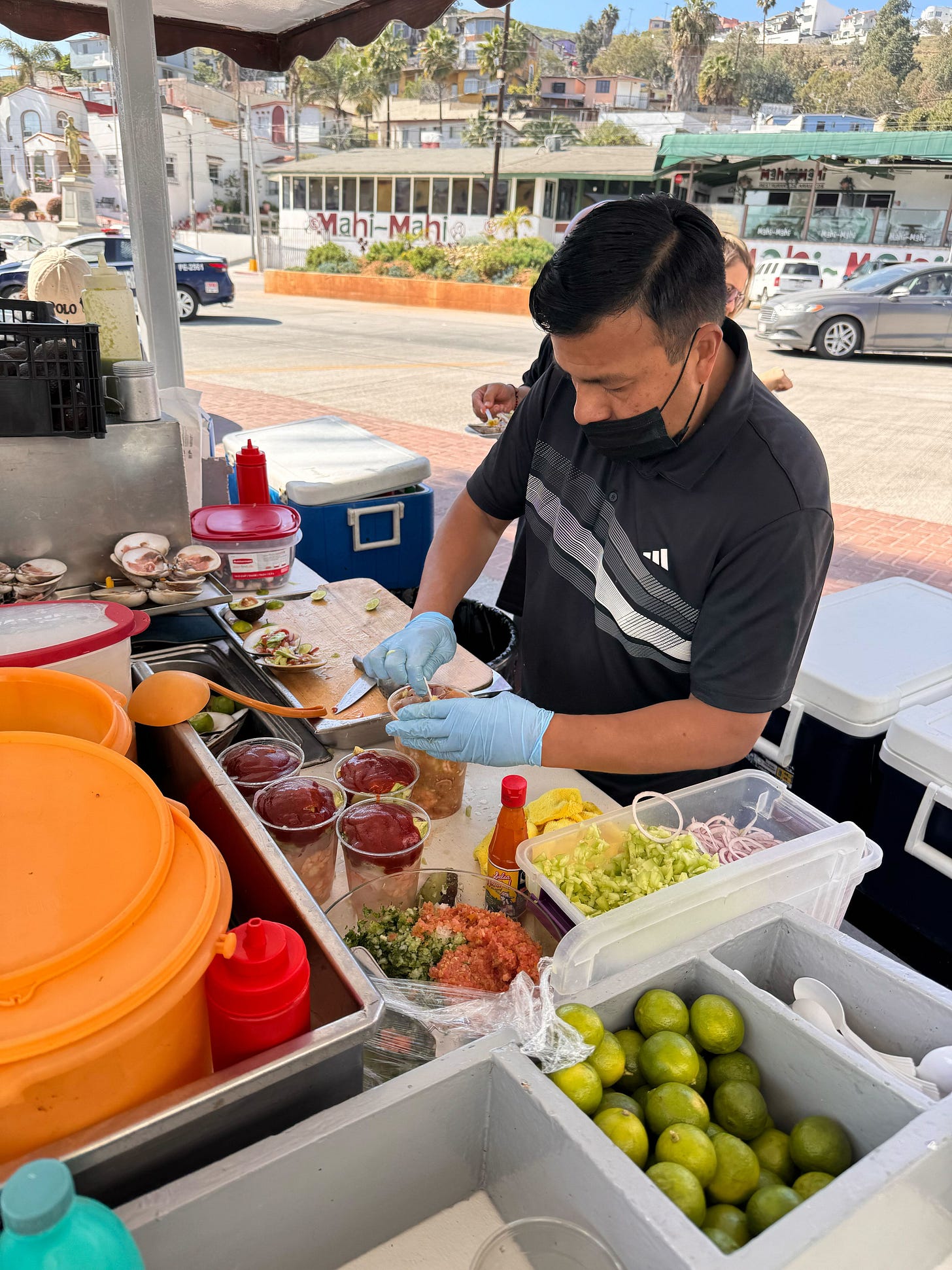 What I Ate: Around 12:05, I spotted someone with a large cup of coctel and found the small stand with three guys already working at a furious pace. It was amazing watching how fast and clean they worked — one making tostadas, one cleaning clams, another assembling cocteles. The coctel master was incredible to watch, tasting each one individually to ensure perfect flavor. We started with a tuna tostada, much smaller than earlier ones, with finely chopped tuna, herbs, peppers, and avocado slices — a really fresh, bright bite punched up with salsa. Next came a clam opened to order, quickly cleaned and mixed with lime, onions, avocado, and housemade cocktail sauce with a horseradish kick. One of the top dishes of the day. Finally, a campechano cocktail made by the master himself — clams, shrimp, and octopus perfectly seasoned in a large glass with cocktail sauce and lime. Each bite delivered the best of the ocean all at once. A can’t-miss Ensenada experience.