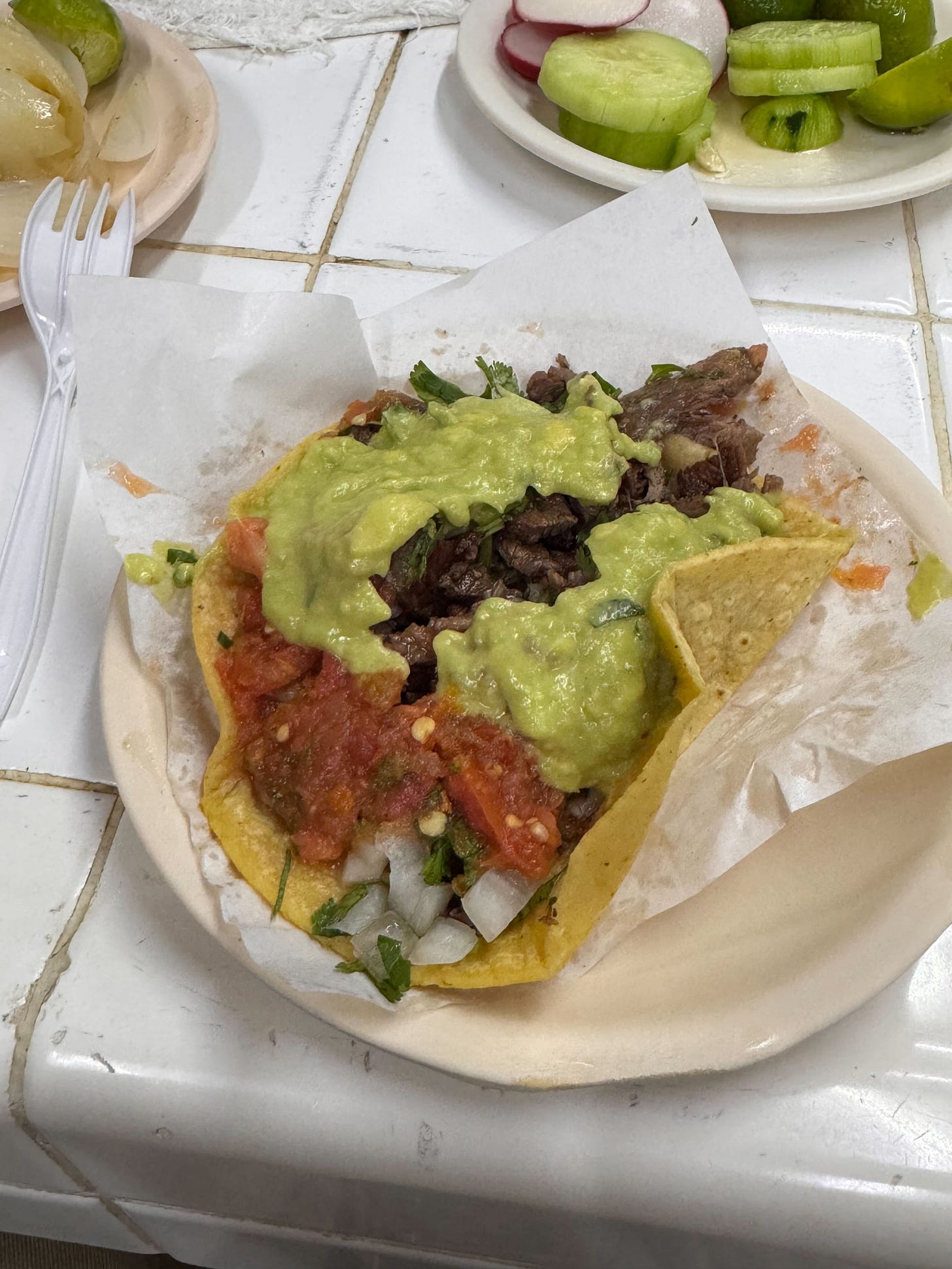 What I Ate: After a flight delay threatened to derail our packed Tijuana itinerary, we finally made it to this wildly busy spot. The inside is stark white with tons of people working behind counters — taqueros and a tortilla assembly line in perfect sync. We went for everything: tongue, cabeza, incredible carne asada, and my personal favorite, their adobada (al pastor). This place should not be missed on any visit to TJ.